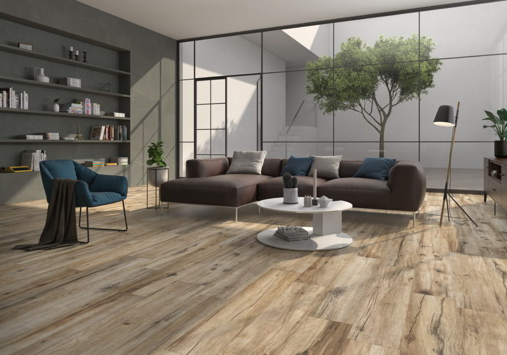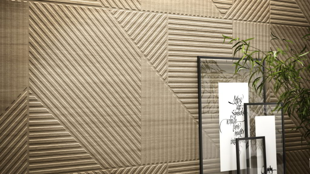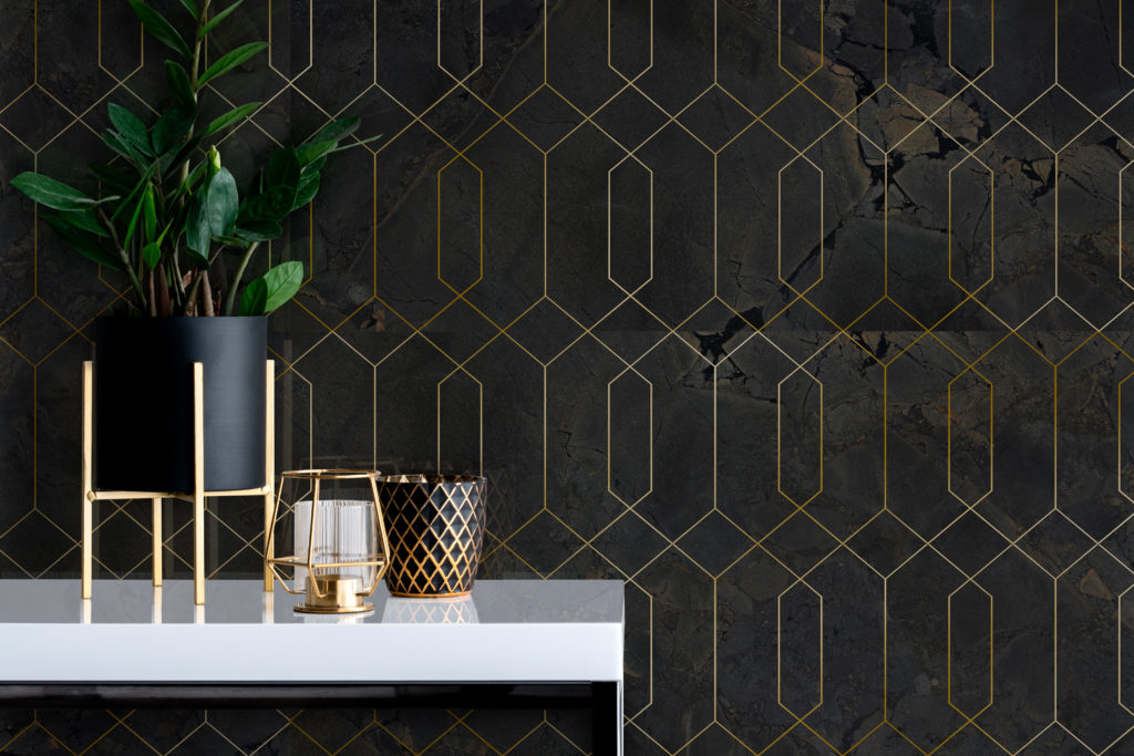Los colores dorados y las formas geométricas son las huellas del art decó. – Soleil Relieve Honey 60×120